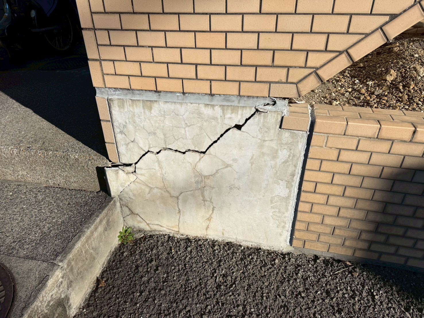 問い合わせ経緯、工事内容 今回のご依頼は、共同住宅、管理会社様からの電話で問い合わせを頂きました。内容としては、基礎部分がクラックで割れてしまった。花壇タイルにひび割れや駆けが無数ある為、タイル交換だと修繕できるかな?どうかな?こんな内容でした。基礎のクラックは、割れてし