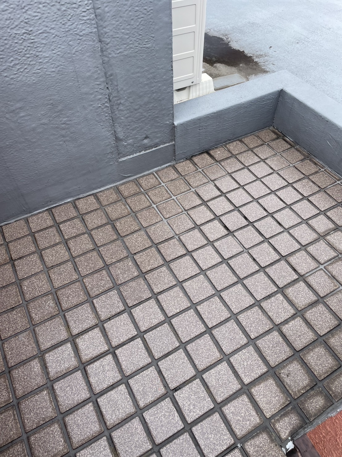 住宅塗装後、最終点検、タイル酸洗い 住宅塗装が終わりました。足場を解体後による最終点検を行います。点検内容としては、移動した植木鉢を戻したり、エアコン室外機をもとの位置に直したり、塗装のチェックはもちろん。足場解体後に落ちたごみを拾ったりします。最後に行うサービスは、玄関