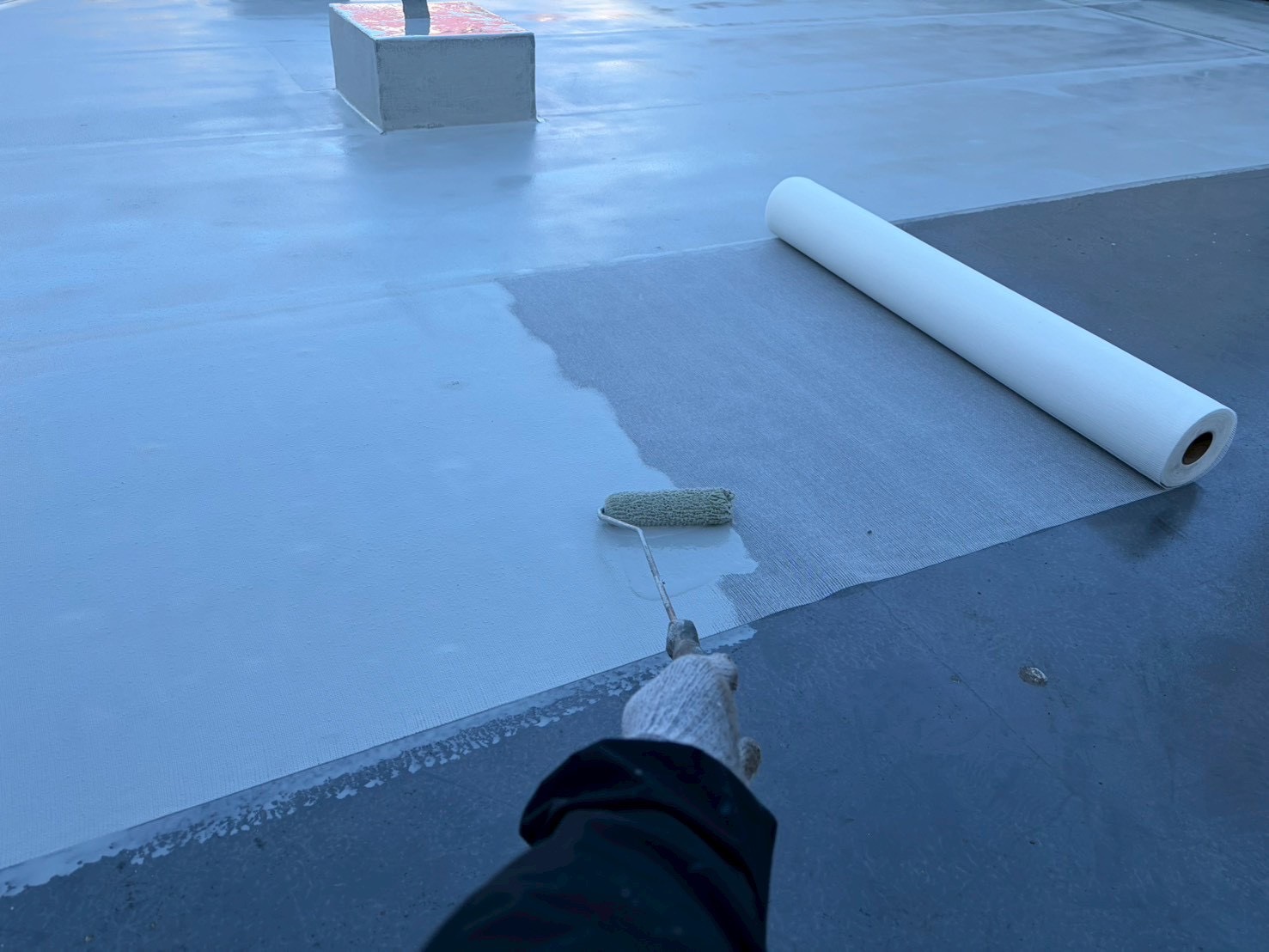 屋上防水、ウレタン密着工法 屋上防水は、建物を塗って雨水から守るのに不可欠な要素であります。屋上防水は、紫外線や雨風に常にさらされています。防水層が劣化すると雨漏れの原因になってしまいます。定期的な診断やメンテナンスが大切になってきます。今回のご契約者様も10年前に緩衝シ
